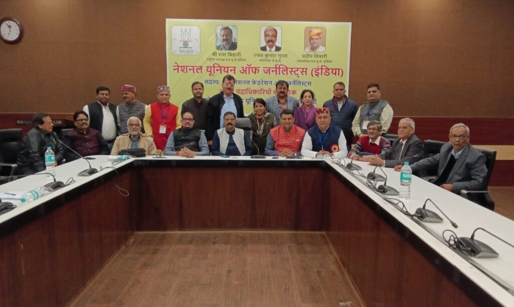 nuj up संरक्षक सुरेन्द्र दुबे और प्रदेश अध्यक्ष वीरेंद्र सक्सेना विभिन्न प्रांतों से आए पदाधिकारियों के साथ